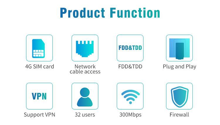 Đó là tốc độ truyền dẫn router WiFi CAT 4 4G lên đến 300Mbps, tốc độ 4G lên đến 150Mbps, TDD-LTE: 150Mbps DL / 50Mbps UL TD-SCDMA: 2.8Mbps DL / 2.2Mbps UL. Thiết bị đầu cuối có thể hỗ trợ ba chế độ liên lạc: TDD FDD, WCDMA. Nó hỗ trợ truy cập Internet /chế độ làm việc PPPoE, sử dụng sim 4G, có thể kết nối với modem hoạt động như chế độ Gateway, được trang bị giao diện 4 LAN, có thể kết nối với các thiết bị khác cùng một lúc. Thật dễ dàng để kết nối và dễ dàng mang theo trong tay Chia sẻ khách hàng đến 32 người dùng WiFi, chỉ cần chèn thẻ SIM, sau đó sẽ có thể thưởng thức WiFi với bộ định tuyến 4G LTE di động này.